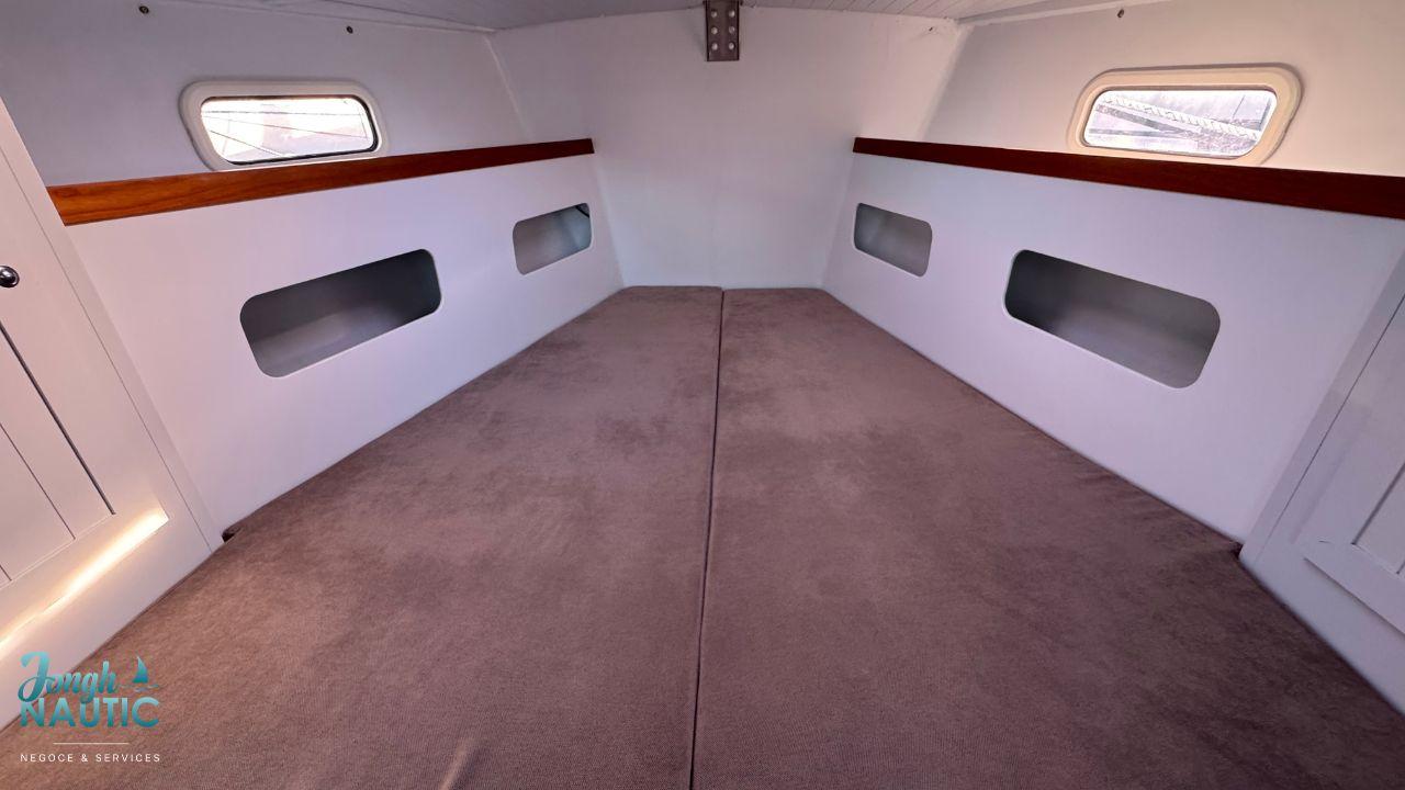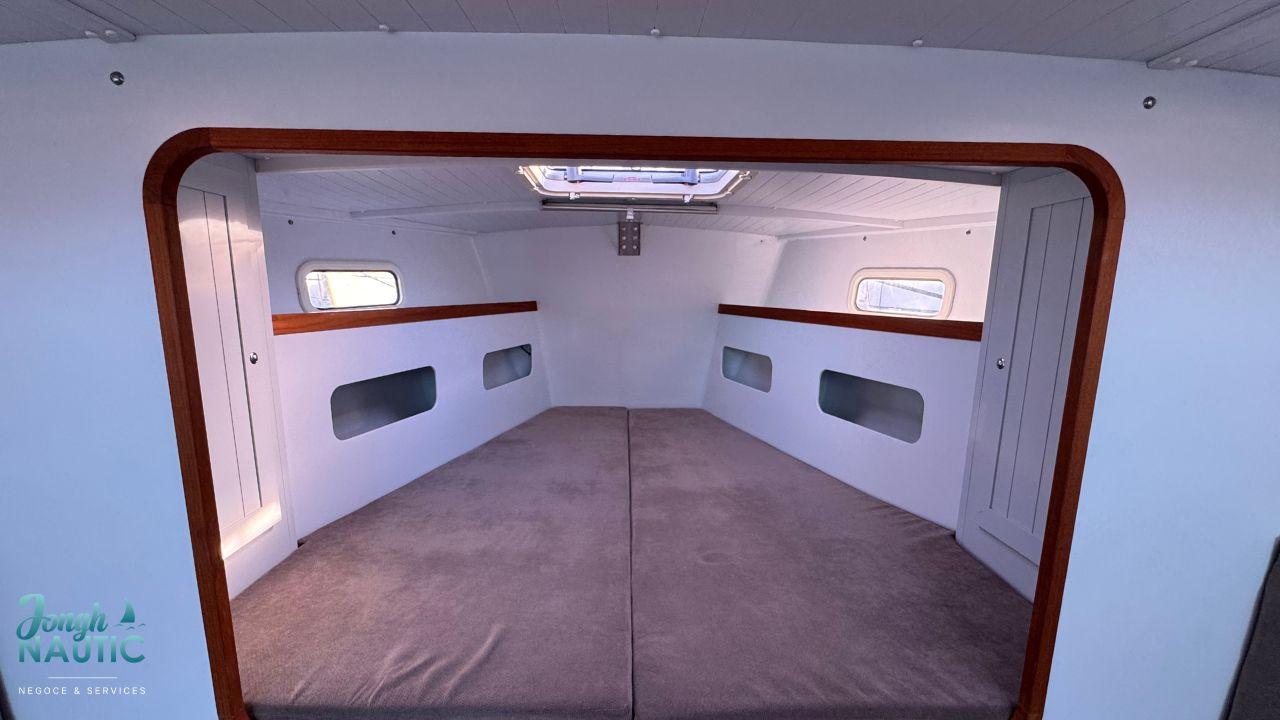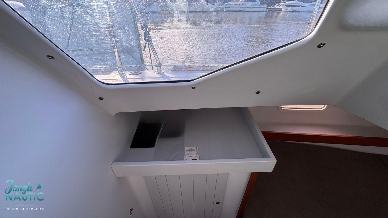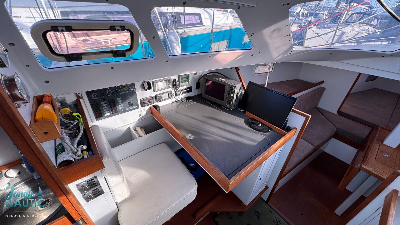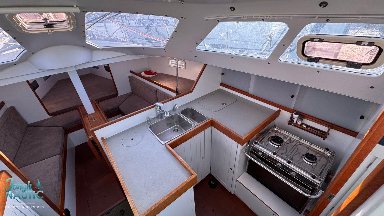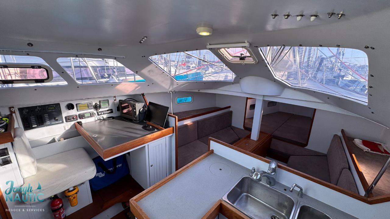 L’intérieur, lumineux et chaleureux, se distingue par de beaux volumes, une circulation fluide, et de nombreux rangements. Le carré spacieux, la cuisine fonctionnelle et les cabines confortables permettent de profiter pleinement de la vie à bord sur de longues navigations ou en croisière côtière.