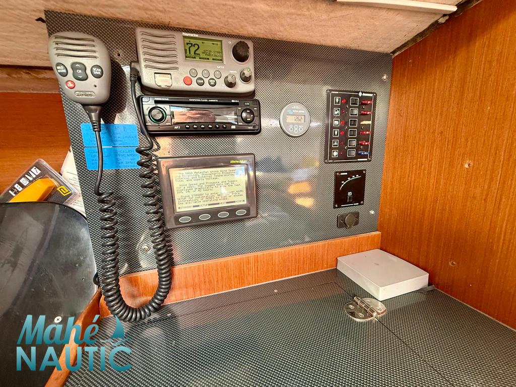 pompe à pied eau de mer, réchaud 2 feux, glacière 60L, rangements), 1 coin navigateur