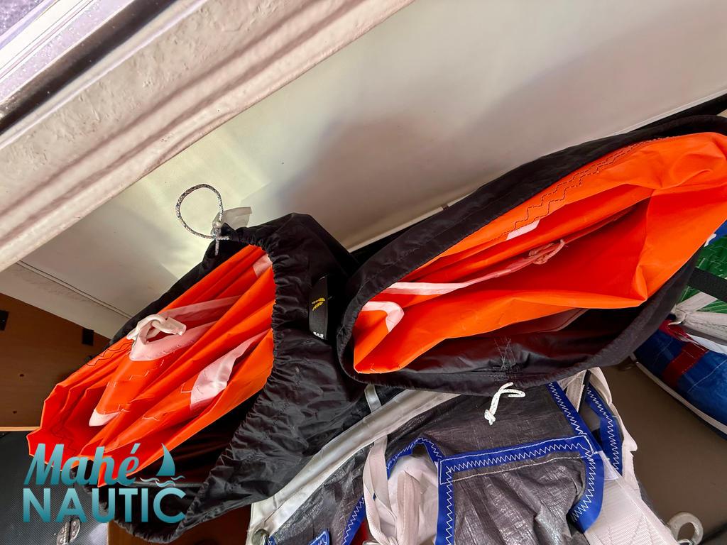 Voiles : achat S2 93m2 occasion Incidences (logoté groupe Legendre) et achat A3 arisable A5 Delta Voiles neuf. Entretien courant autres voiles.